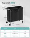 This laundry basket with 200 liters capacity features three compartments, wheels, and a handle for easy transportation.