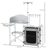 MULTIFUNCTIONEEL ONTWERP: Aluminium tafelblad met windscherm, twee bijzettafels en een onderste plank, 4 haken voor keukengerei. Tweelaags stoffen kast met rits en zijvakken. Verstelbare hoogte lampenstandaards voor licht.