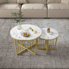Enhance your modern home with these elegant high gloss marble look nesting coffee tables. This set includes a large table (70x70x50 cm) and a smaller table (50x50x45 cm) that can be used together or individually. Featuring high-gloss marble-look tops and gold-plated iron legs for stability and durability, this set adds a luxurious touch to any room.