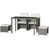 The Rootz Garden Furniture Set is perfect for small gardens or terraces, featuring a large rectangular table, 2 chairs, and 2 stools with removable, washable white pillows. Crafted from durable metal and stylish PE-Rattan imitation, this lightweight set is easy to move and store, making it convenient for any outdoor space.
