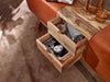 Een moderne interpretatie van de retrostijl. Gemaakt van massief hout en echt leer, met twee praktische lades, stevige zitkussens en een maximale draagkracht van 200 kg. Deze handgemaakte bank combineert stijl, functionaliteit en individualiteit met zijn unieke houtnerf en luxe bekleding.