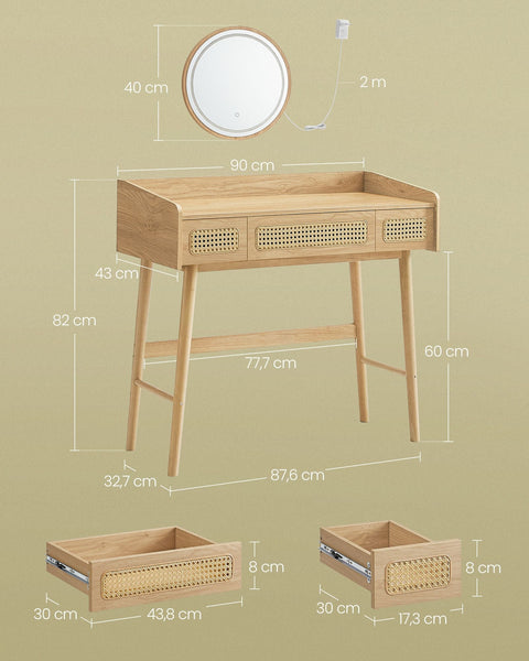 Rootz Dressing Table with Mirror and Lighting - Vanity Set - Makeup Table - Solid Wood Legs - MDF - Oak Beige - 43cm x 90cm x 82cm
