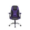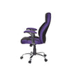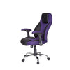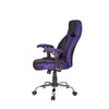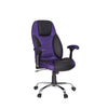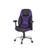 Swivel chair with a high backrest and elegant headrest. Elegant and 2-tone opulent upholstery. The fabric has the colors purple and black. The armrests have a soft padding for extra comfort. The foot is made of chromed metal, shaped and robust.