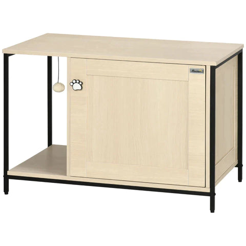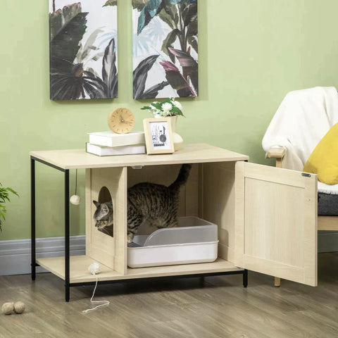 Rootz Litter Box - Cat House - Magnetic Side Door - Hanging Play Ball - Floor Clearance - Chipboard/Steel - Oak - 80 x 48 x 55cm