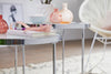 A modern and unique design that effortlessly combines style and functionality, featuring a clear glass top and a sturdy chromed metal frame, perfect for showcasing your decorative items or creating additional surface space in any room.