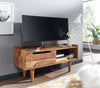 Introducing our meticulously handcrafted TV stand with a modern design, featuring expressive natural wood grain, a spacious rectangular shelf for your TV, and two compartments with cable passages, making it ideal for TVs up to 50 inches and offering a practical sliding door for convenient storage, all while showcasing the unique beauty of solid sheesham wood.