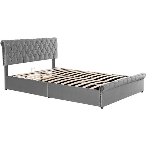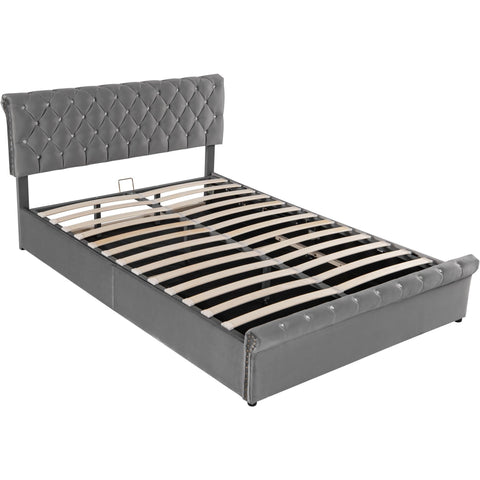 The Rootz Upholstered Bed with Hydraulic Storage and Height-Adjustable Headboard Experience luxurious sleeping comfort with our gray velvet upholstered bed combining elegance and functionality. The height-adjustable headboard with crystal buckles...
