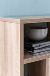 The sleek and contemporary Rootz wall shelf, featuring nine differently-sized shelves for versatile storage of decorations, books, and more, with a scratch-resistant and water-repellent Sonoma oak finish, providing ample space and functionality for all your organizational needs.