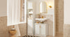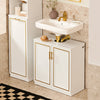 This base cabinet has two doors and a divider, providing ample space for everyday items like toilet paper and cleaning products. The white MDF(E1) cabinet with gold handles offers a stylish look while concealing the drainage system. Foot pads protect the paint from moisture, making it more durable and long-lasting.