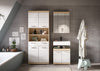 This elegant 3-piece bathroom combination in Brown and high-gloss white offers modern design with superior functionality. It includes a vanity unit, mirror cabinet, and tall cabinet, all crafted to harmonize beautifully. The durable, easy-care MDF front with milled grooves enhances aesthetic appeal while ensuring durability. Transform your bathroom into a stylish, organized oasis with ample storage for essentials, complementing any contemporary decor.