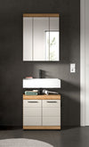 This compact bathroom combination features a vanity unit and mirror cabinet inBrown and White imitation. With its dimensions of 60x191x34 cm, it's perfect for smaller bathrooms. The high-quality, easy-care MDF front with milled grooves adds a modern touch. This set provides ample storage space, ensuring your toiletries are neatly organized while maintaining a contemporary look.
