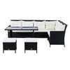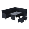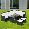 NOBLE POLY RAT SOFA SET: Comfortable 18-piece seating group for indoor and outdoor use. Your set includes 1 table, 2 stools, 1 corner sofa, 2 double sofas, and seat and back cushions.