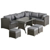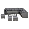 10-PIECE GARDEN FURNITURE SET: The set consists of 3 corner pieces, 3 middle sofas, a table and 3 stools. All seating comes with seat cushions and backrests for seating comfort