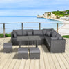 Our elegant poly rattan sofa set from Rootz is the perfect place to relax on warmer days. The 10-piece set is characterized by its modern design and high-quality workmanship. This makes your seating group perfect for outdoor use. The spacious table has a resilient glass top and is ideal for having breakfast or dinner together.