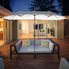 It's time for your garden to shine with this Rootz double-sided parasol. The stylish parasol is equipped with 48 lights on the parasol ribs that illuminate your outdoor seating area after dark. The double-sided garden parasol provides plenty of shade and protects you from direct sunlight. This LED lighted garden umbrella is an ideal companion for you and your family and friends to relax in summer.