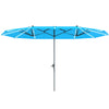 The Rootz double umbrella, featuring solar lights and a sleek blue aluminum frame, provides UPF50+ UV protection with its durable polyester fabric. This UV-resistant terrace umbrella is perfect for creating an inviting outdoor atmosphere day or night. Enjoy enhanced durability with its robust aluminum and fiberglass structure, ensuring stability and ease of use.