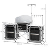 Experience culinary enjoyment in the open air with the folding camping kitchen from Rootz. Not only will there be space for your cookware, but you will also have a perfectly organized cooking environment. With three table tops, a bottom shelf, three fabric storage compartments, four hooks, and a height-adjustable light stand, you have everything at your fingertips. Enjoy nature to the fullest without sacrificing culinary comfort.Additional usable space: Thanks to 2 side table tops and a lower shelf, you have ample space to prepare and organize your meals efficiently.Easy access to groceries: The 3 fabric shelves with roll-up zipper doors allow you to store and access your groceries effortlessly, keeping everything within reach.Convenient hanging hooks: The 4 removable hooks are perfect for hanging your trowel, spatula, and other cooking utensils, ensuring a clutter-free workspace.Adjustable lamp stand: The height-adjustable lamp stand, ranging from 70 cm to 120 cm, provides optimal lighting for your cooking area, making meal preparation easier and safer.- Color: Gray+Silver