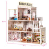 Our Wooden Shopping Mall Dollhouse features a captivating shopping mall theme. It's designed to resemble a bustling shopping center, complete with six charming mini shops, including a flower shop, bakery, hair salon, jewelry store, VIP lounge, and fruit stand.