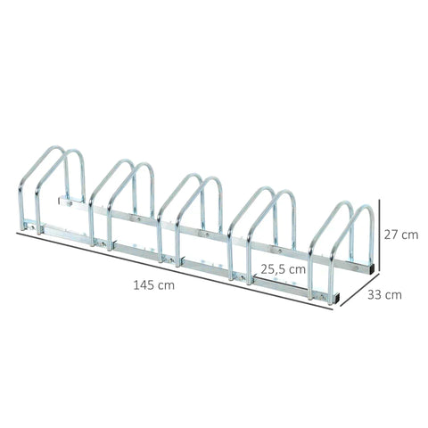 Rootz Bicycle Stand - Bike Stand - Bicycle Stand For 5 Bicycles - Weatherproof - Wall Or Floor Mounting - Steel - Silver - 145 x 33 x 27 cm