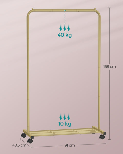 Rootz Gold Steel Clothes Rack on Wheels - Garment Rack - Rolling Wardrobe - Heavy Duty - Portable - Easy Assembly - 40.5cm x 91cm x 158cm