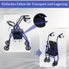 Our Rootz Rollator with Chair combines a walker and a resting place in one innovative design. This foldable mobility aid features an adjustable height handle, a removable washable storage bag, and a sturdy metal frame for durability and lightweight portability.
